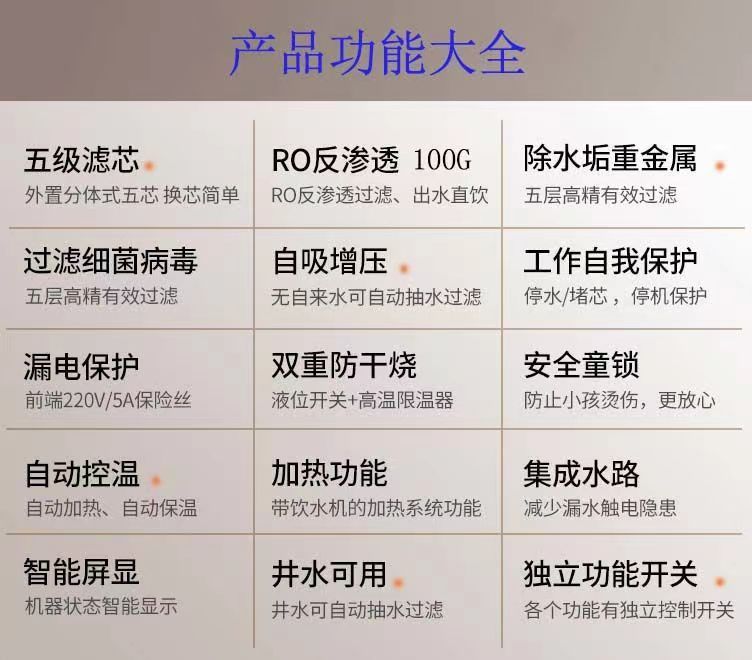 ★开水、温水、凉水,使用更方便。★反渗透技术,长效滤材,健康饮水。★占用空间小,使用方便。★高标准,内置无菌水箱。★微电脑智能化控制,智能滤芯提醒,自动冲洗。★食品级水电路管接件配置。★有效去除水中重金属离子、有机物、细菌病毒、农药残留等有害物质。适用范围:超市,个体经营户,家庭等