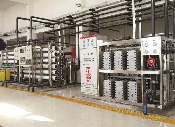 超纯水设备是反渗透设备跟离子交换混床或EDI相结合配套使用,离子交换混床是通过离子交换树脂在电解质溶液中进行的,可去除水中的各种阴、阳离子,是目前制取高纯水工艺流程中的手段。离子交换器分为阳离子交换器、阴离子交换器等。 当原水通过离子交换柱时,水中的阳离子和水中的阴离子(HCO3-等离子)与交换柱中的阳树脂的H+离子和阴树脂的OH-离子进行交换,从而达到脱盐的目的。阳、阴混柱的不同组合可使水质达到更高的要求。