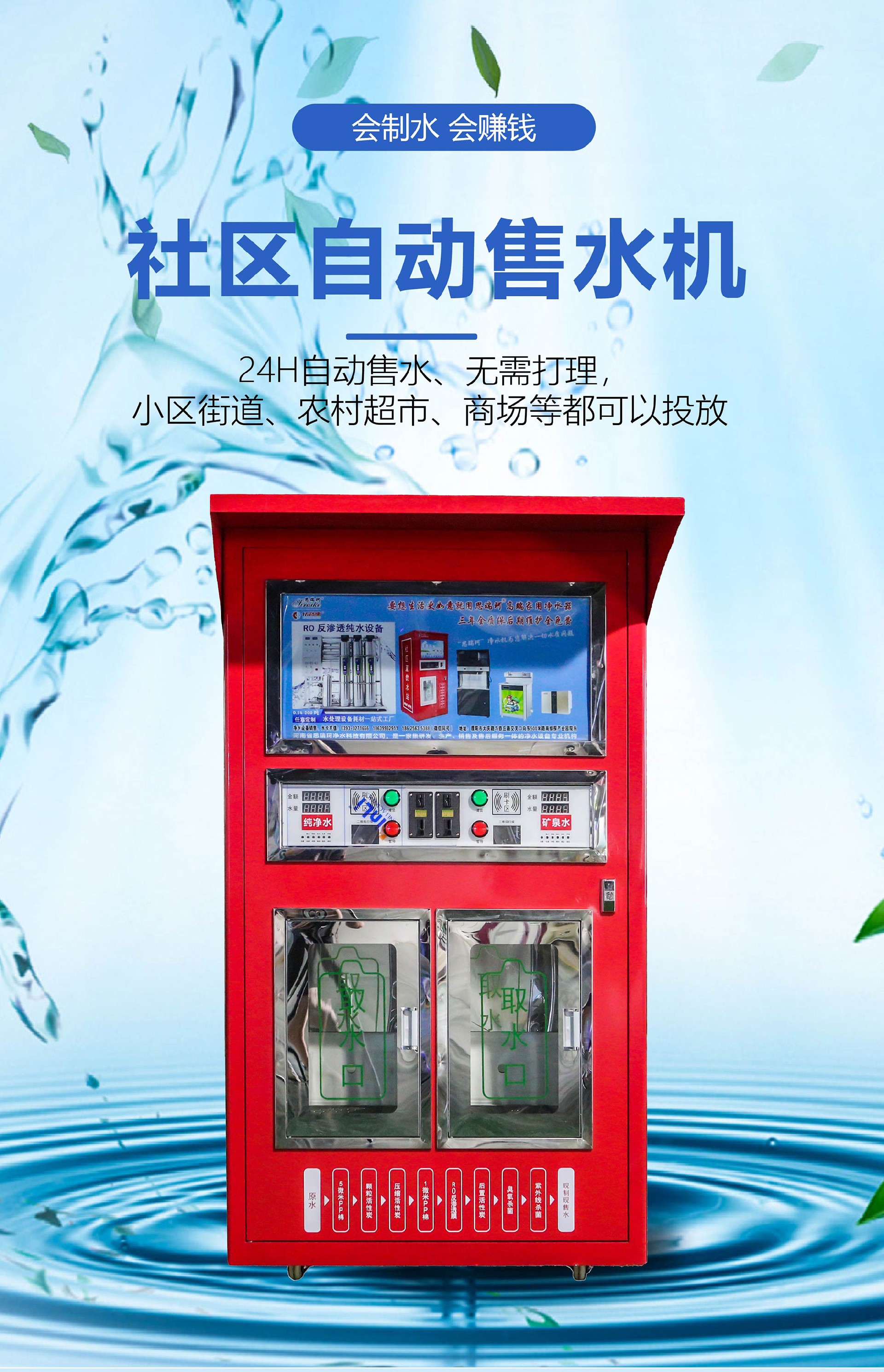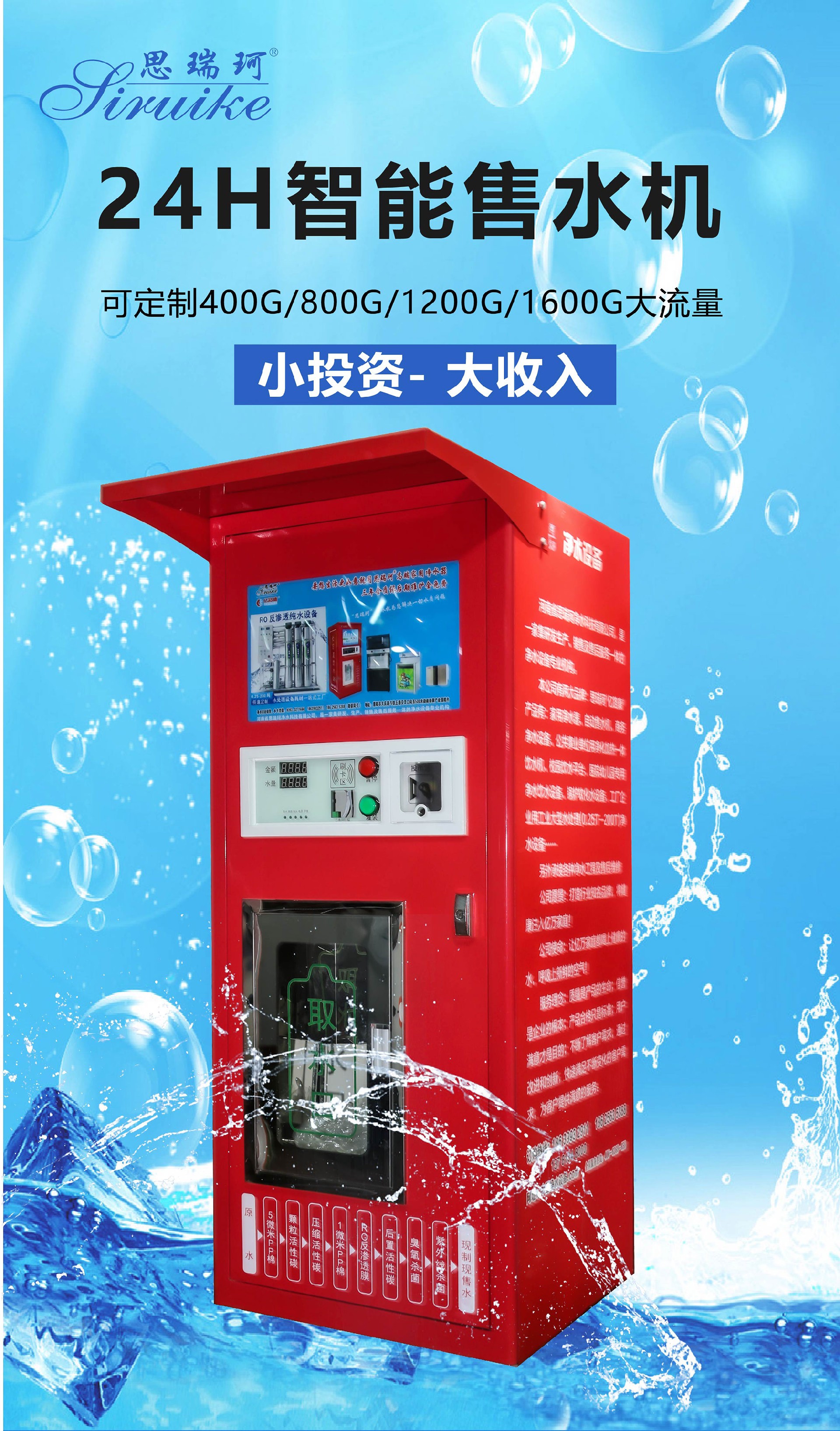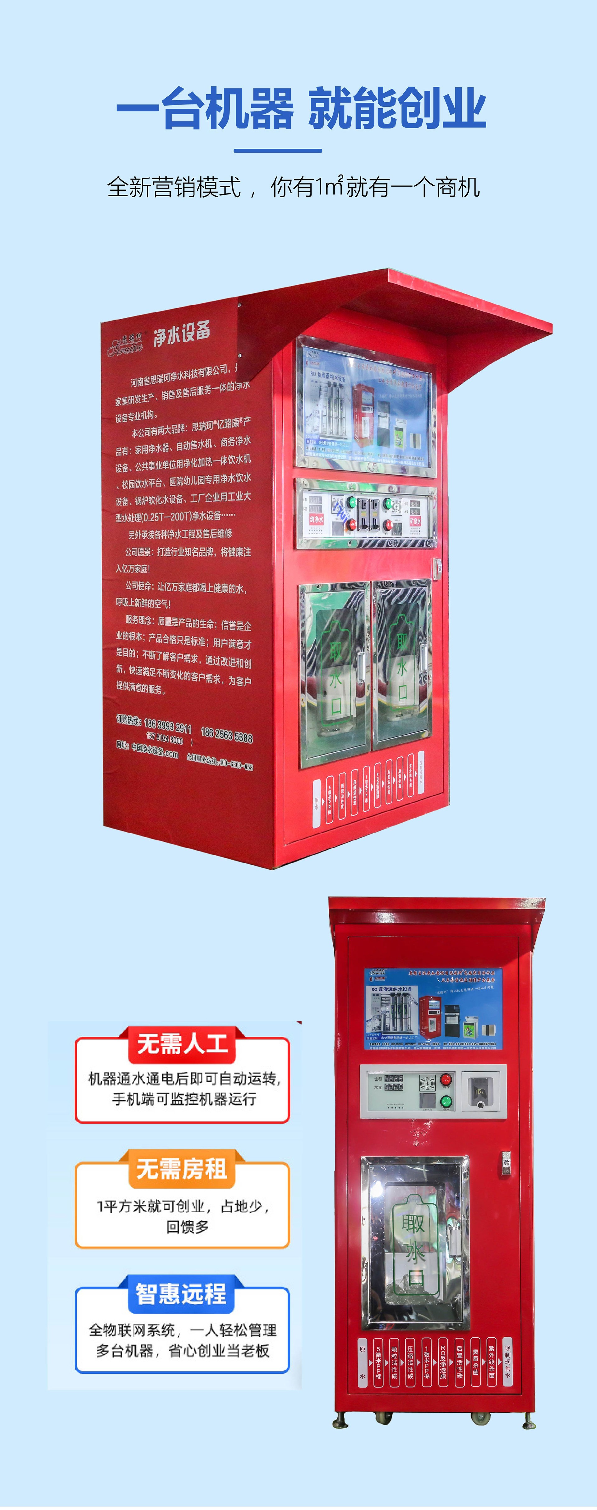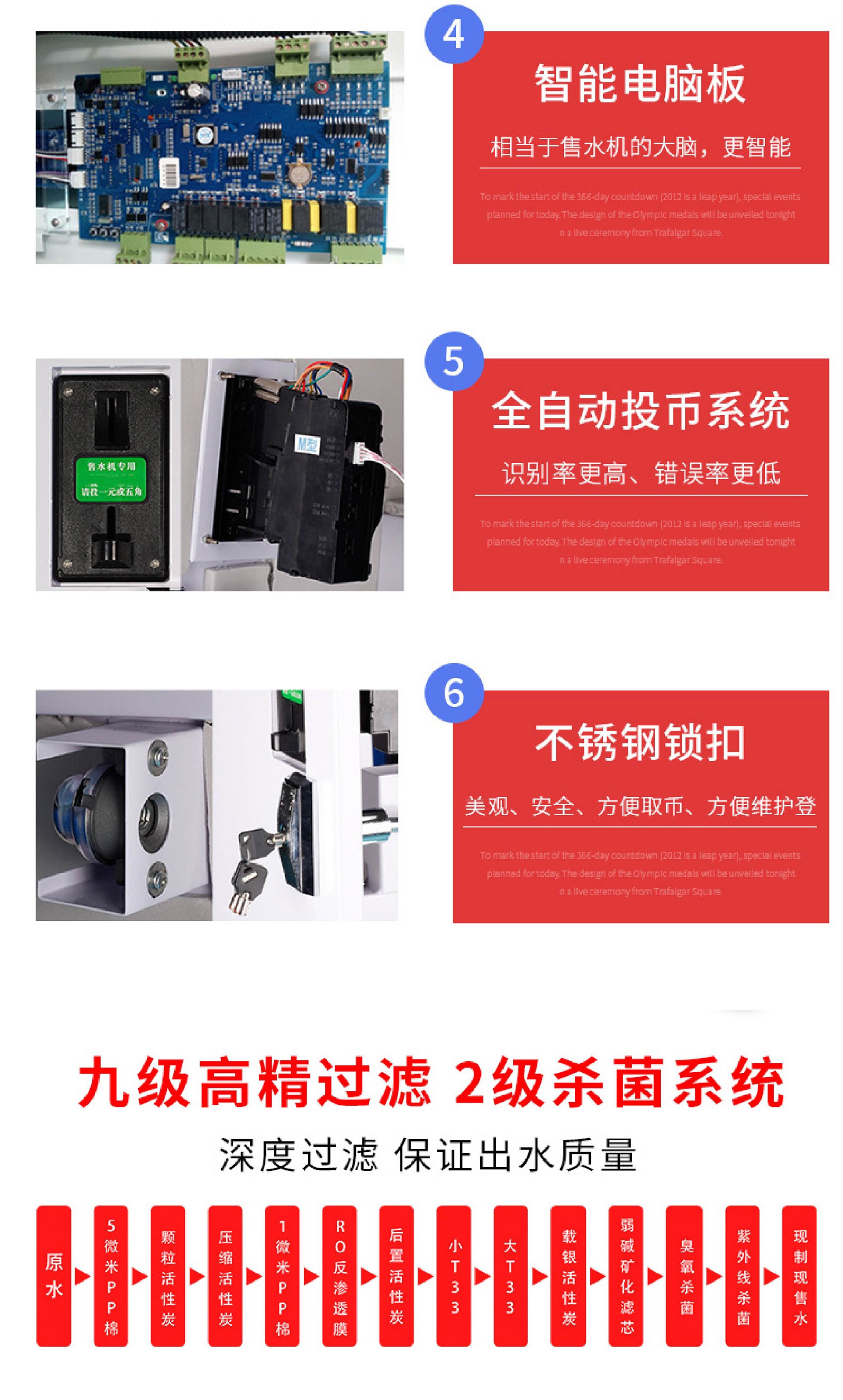 *双打水口双倍收益*加厚机壳一体喷塑*9级-13级高精过滤*2级杀菌安全系统*全功能集成主板*刷卡投币扫码支付*远程操控后台管理*远程水卡充值挂失*智能温控系统*三合一保温系统*智能门禁系统